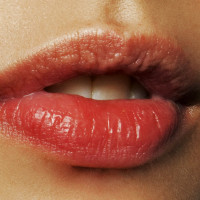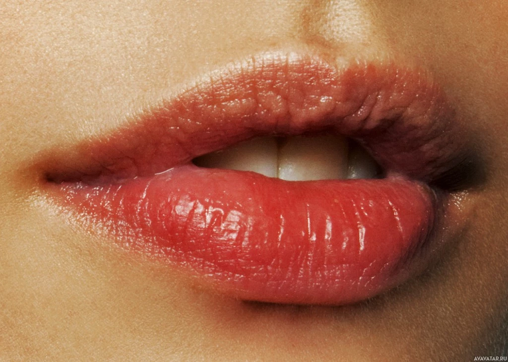 Картинка показывает крупный план чьих-то губ с красной помадой. У человека розоватая кожа, а помада выглядит глянцевой, отражая свет в определенных областях.