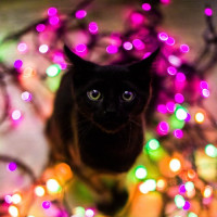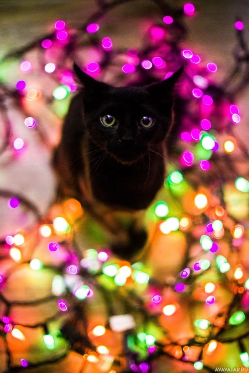 На картинке изображена черная кошка, стоящая среди красочных рождественских огней. Это очаровательная и праздничная сцена, где кошка смотрит прямо в камеру, придавая ей несколько удивленное или любопытное выражение.