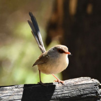 In the picture, there is a bird standing on a piece of wood. The bird has spread its wings slightly and appears to be either preparing to fly or just finished landing. It is situated in an outdoor setting with greenery around, suggesting it might be in a park or a natural habitat.