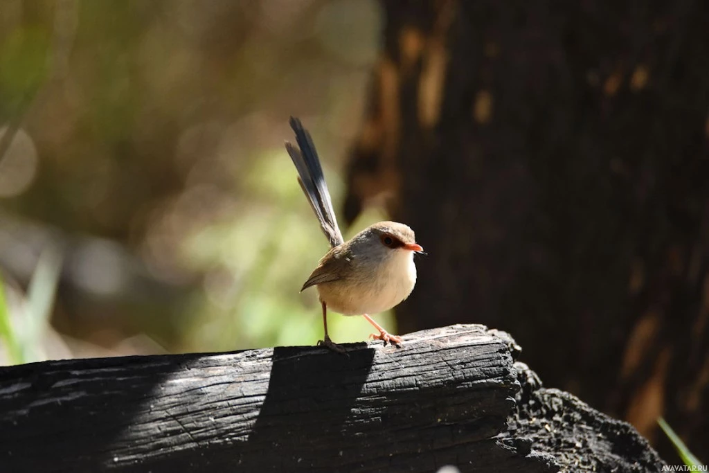 На картине изображена птица, стоящая на куске дерева. Птица слегка расправила крылья и, похоже, либо готовится к полёту, либо только что закончила посадку. Он расположен на открытом воздухе с зеленью вокруг, предполагая, что он может быть в парке или естественной среде обитания.