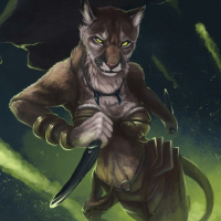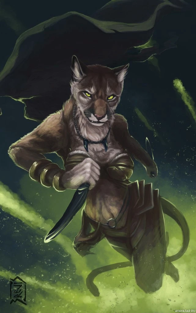 the distinctive ears and eyes characteristic of feline creatures, along with a tail hanging down from behind her. The background has an ominous or magical quality to it, enhancing
