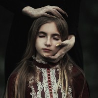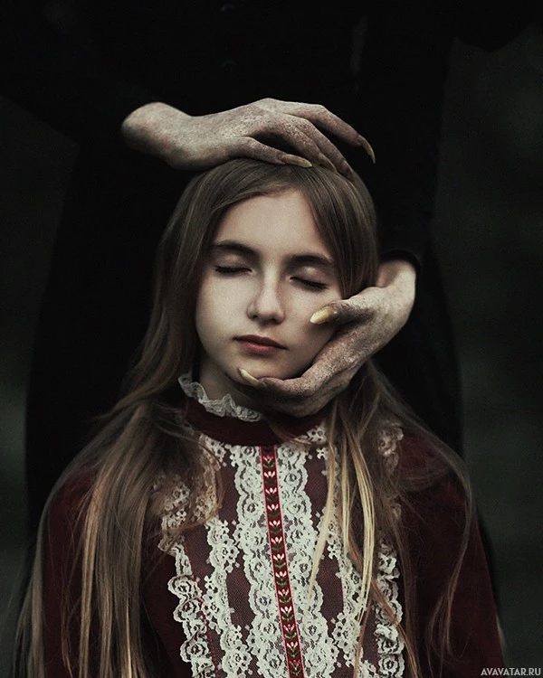 a state of peacefulness. Another person's hand is placed on her forehead, suggesting a comforting gesture, but the context is ambiguous, given that the individual is partially obscured by shadow, which adds to the ominous
