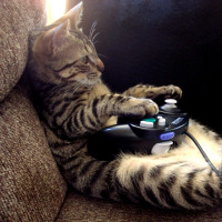 a video game, as it has its paws stretched out in front of it as if it were using a controller. This gives the impression that the cat is engaged in the activity of gaming and being humorous by mimicking