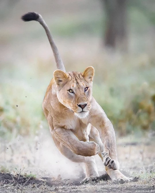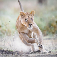a natural setting with vegetation, possibly a savanna or grassland environment typical for lions. The dust in the air suggests movement, which adds to
