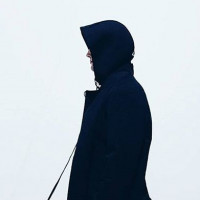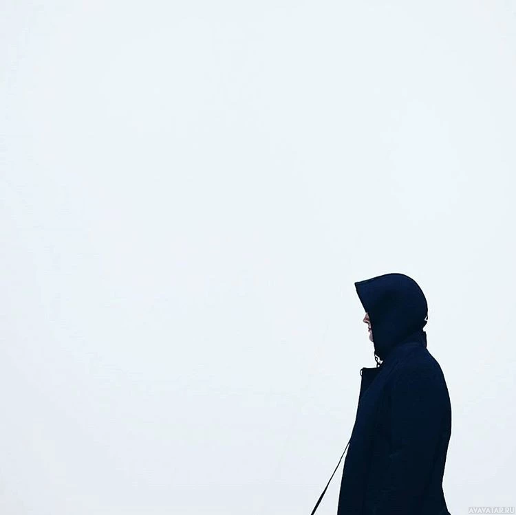 На картинке изображен человек, удаляющийся от камеры, обращенный к правой стороне кадра. Они носят темную куртку или пальто с капюшоном, заслоняющим голову и большую часть лица. Фон нейтральный по цвету, что создает монохромный эффект.