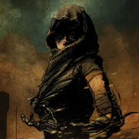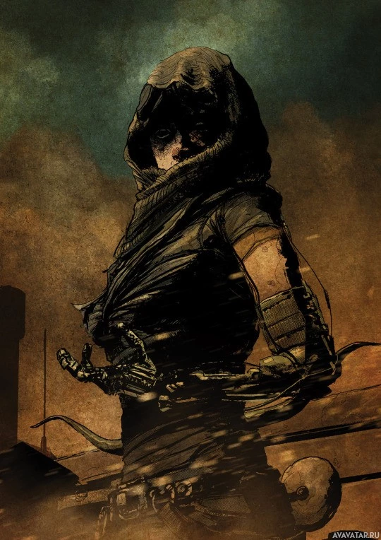 a hooded cloak that drapes over her shoulders. Her attire and demeanor suggest she might be in