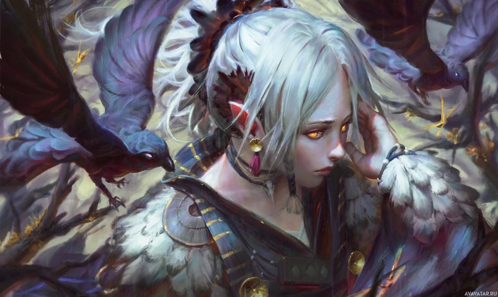 white hair styled in a bun. The character is wearing what looks like armor or a garment with fur details. There are birds surrounding the character, some landing on the armor or perched on branches. The artwork conveys a sense of magic and fantasy, which is common in depictions of elves within the realm of