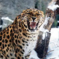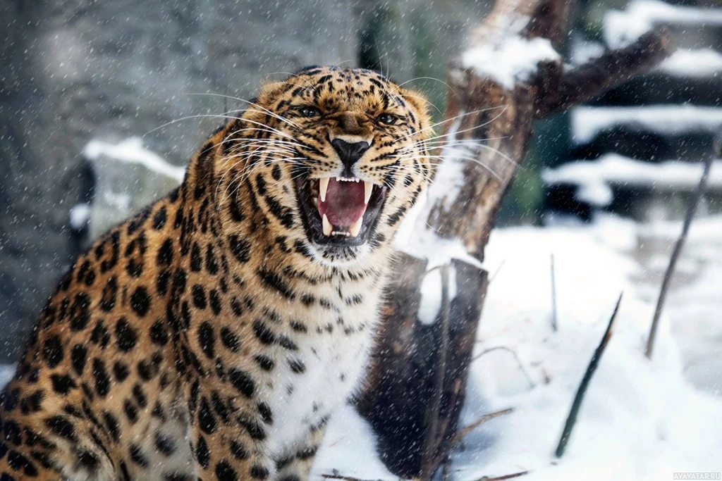 the presence of snow on the ground and possibly falling from the sky. The leopard has its mouth open and eyes closed, giving the impression that it might be roaring or growling.