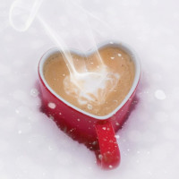 На картинке изображена кофейная чашка в форме сердца, сидящая в снегу. Из чашки поднимается пар, что говорит о том, что кофе горячий и недавно налили или нагрели.