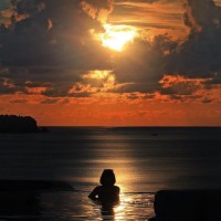 The image shows a silhouette of a person sitting in a pool at sunset. The colors in the sky are warm, with hues of orange and yellow, suggesting that the photo was taken during what is often referred to as "the golden hour," which offers dramatic lighting for photography. The reflection of the person in the water adds depth to the scene. The presence of clouds suggests it might be a partly cloudy day.