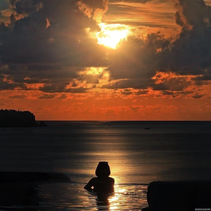На картинке изображен силуэт человека, сидящего в бассейне на закате. Цвета в небе теплые, с оттенками оранжевого и желтого, что говорит о том, что фотография была сделана во время того, что часто называют «золотым часом», который предлагает драматическое освещение для фотографии. Отражение человека в воде добавляет глубину сцене. Наличие облаков предполагает, что это может быть частично облачный день.