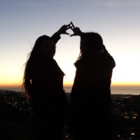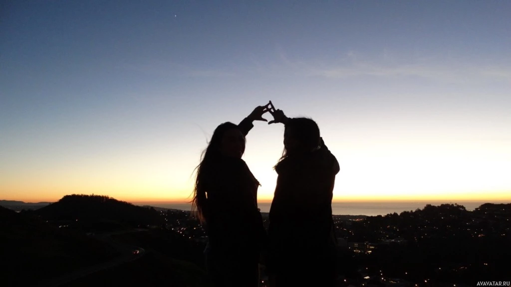 The image shows a silhouette of two individuals sharing a moment together at sunset or dusk. One person appears to be giving a hug, while the other is returning it. They both have their arms around each other's shoulders. It seems like they might be friends or family members enjoying