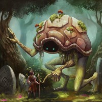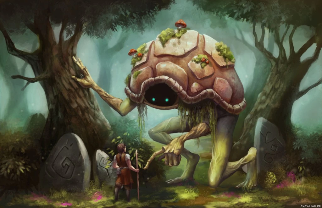 a fantasy setting. This character has an unusual appearance with what seems like a turtle-like shell on its back and possibly some sort of plant-like growths or tendrils emanating from its body. The character is interacting with another figure that looks more human in nature, standing slightly behind it. They are both set within a lush,