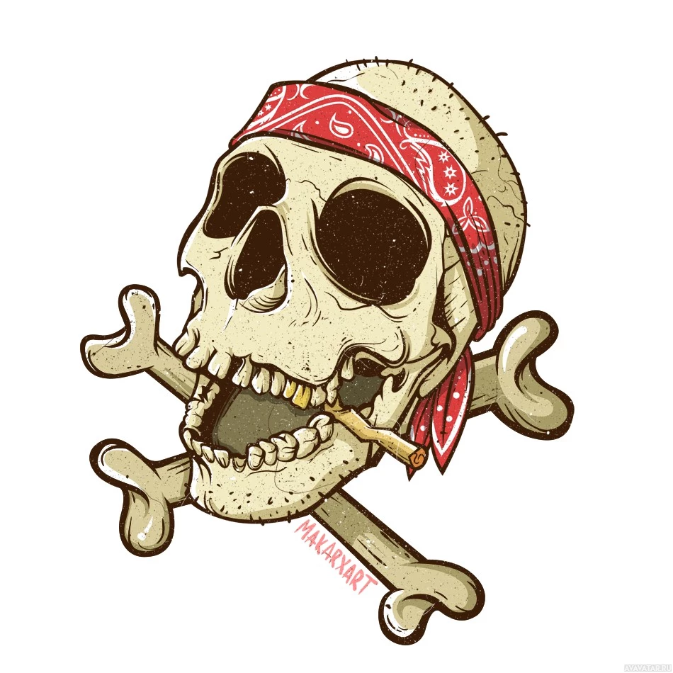 pop culture representations of pirates. There's also a cigarette placed on its teeth, suggesting a nonchalant or carefree attitude. The skull has two crossed bones where you would typically expect to see eyes, adding to