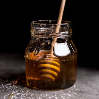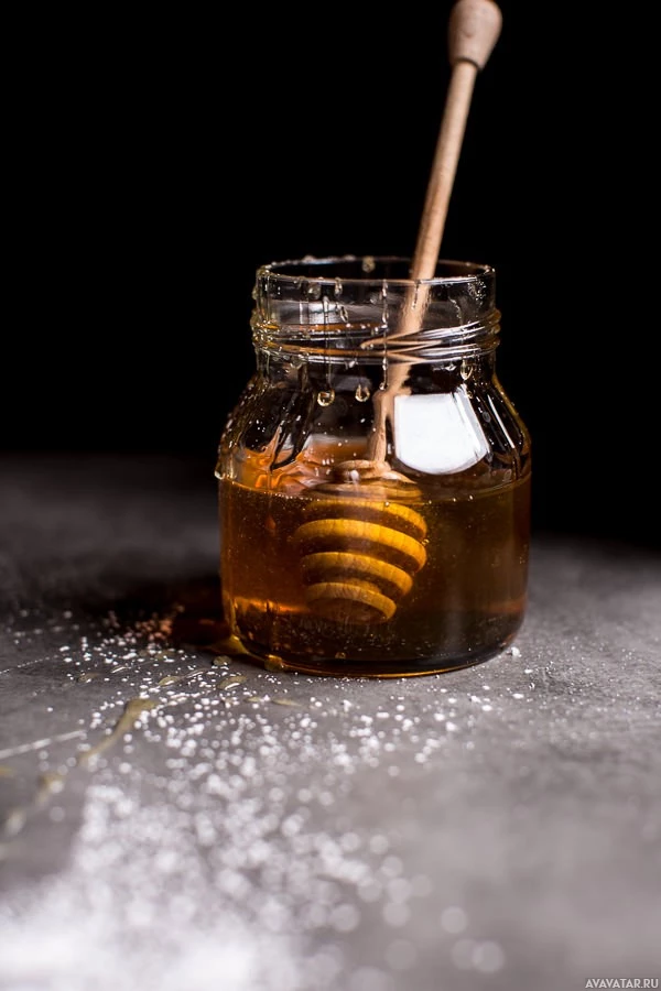На снимке показана баночка меда, которая является разновидностью кондитерской. Он, по-видимому, свежеизготовлен или извлечен из соты, о чем свидетельствует наличие пчел сверху и покоящегося в ней инструмента пчеловода.