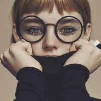На снимке изображена девушка в очках с круглыми линзами. У нее светлые волосы, а выражение лица нейтральное. Она, кажется, в помещении с простым фоном.