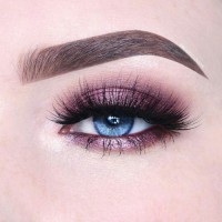 blue tones, which complements the person's natural eye color. Additionally, there is visible mascara on the lashes. There's also a shimmery purple or rose