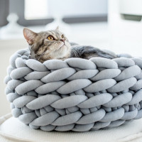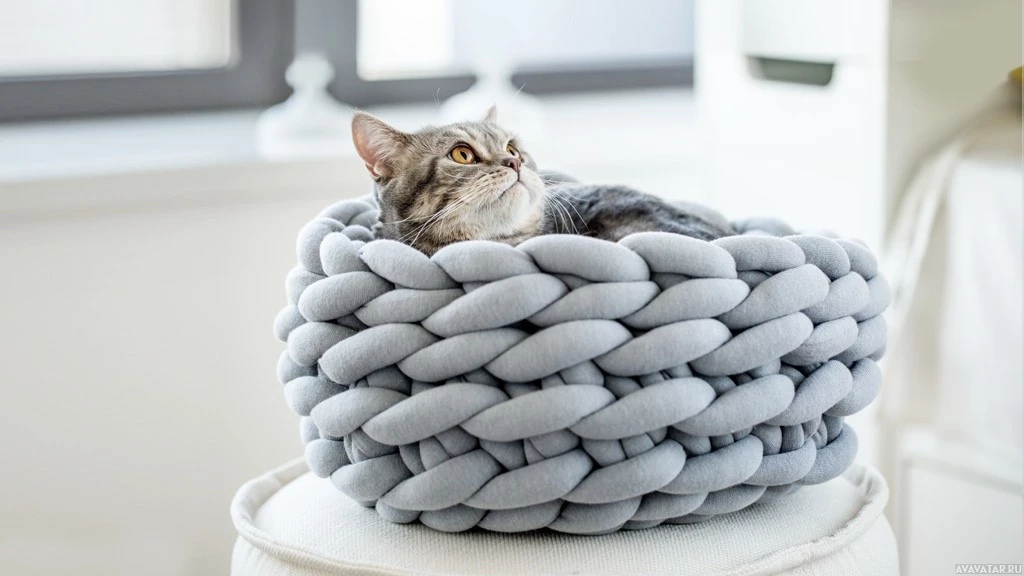 На снимке изображен кот, лежащий внутри уютной, круглой кровати с мягкой амортизацией. Кошка кажется расслабленной и комфортной, выглядывая с внимательным выражением лица. Он окружен тем, что выглядит как плюшевая, теплая среда, возможно, в помещении.