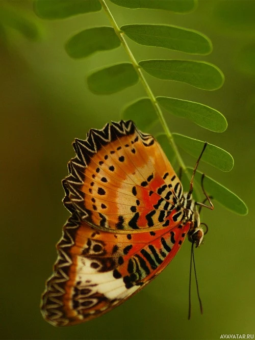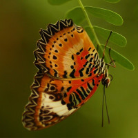 shades of orange, red, white, and black. The butterfly is perched on a leaf or perhaps the edge of