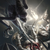 stakes battle between two worlds, with a clear division between the forces of nature or chaos embodied by the monster, and the order and defense represented by the knights or soldiers.