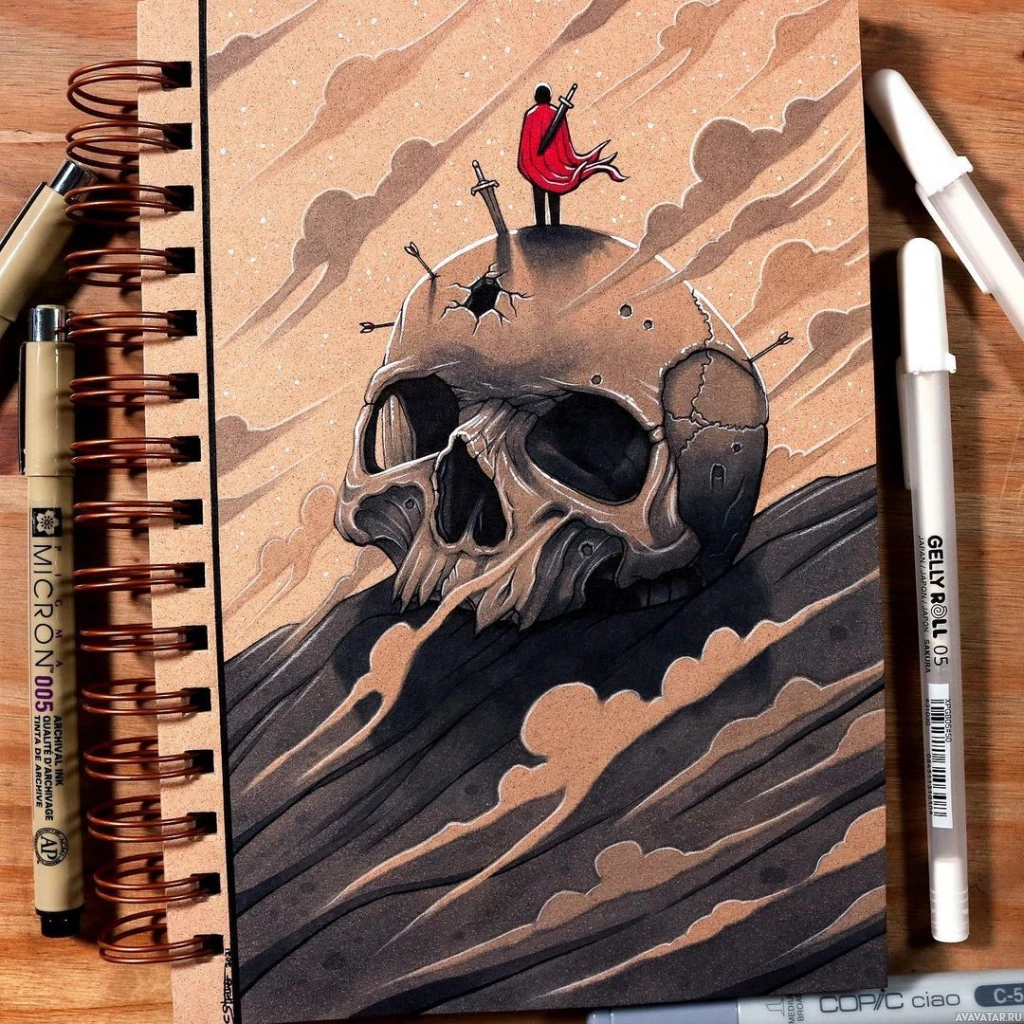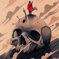 the open mouth of the skull, there is a small figure, which seems to represent a person or possibly an entity of some sort, given its anthropomorphic features such as arms and legs. The artwork has a monochromatic color scheme with shades of brown, gray, black, and white, creating a somewhat