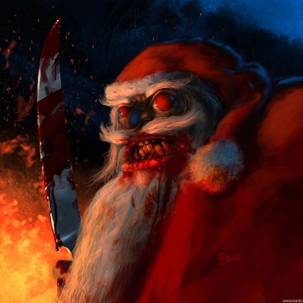Santa Claus holding a bloody knife in one hand. He appears menacing and is set against a dark,