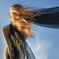 an impression of freedom and movement. Her hair appears to be blowing slightly, suggesting there might be