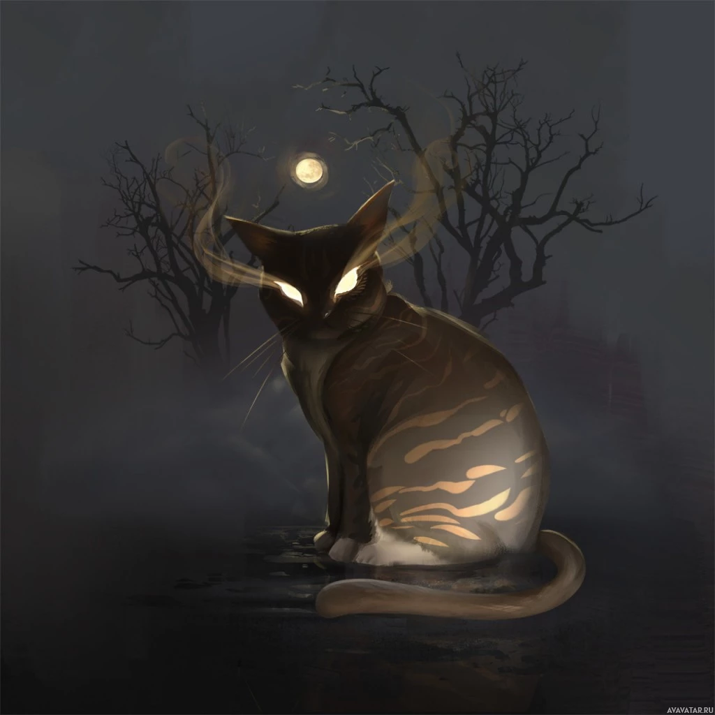 striking eyes that glow and appears to be casting a spell or performing some kind of magic with its paws. In the background, there are silhouettes of trees and