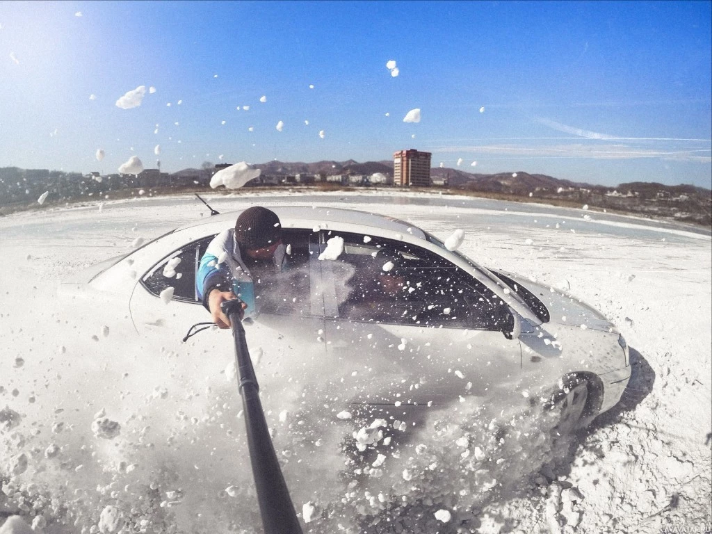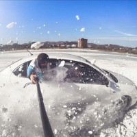 The image shows a car driving through what appears to be snow or ice, resulting in the splash of snow around it. There is a person inside the car who seems to be taking a selfie with the camera, which can also be seen reflected in the car's side mirror. The driver is visible from behind and is holding onto something outside the vehicle, likely part of an activity or stunt. The setting looks like an outdoor area with