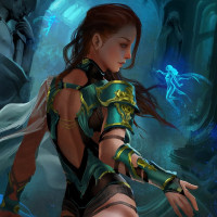 a female character with red hair, set in a fantasy-themed environment. She is shown from behind and appears to be wearing armor or combat gear. There are also mystical elements such as what seem to be