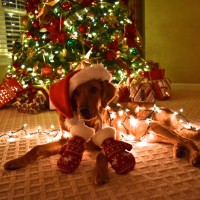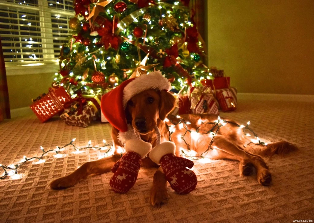 the holiday season. The room seems cozy and well-decorated for Christmas, with the dog adding