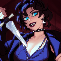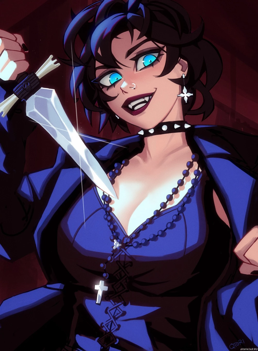 blue hair, blue eyes, and is wearing dark attire with accessories like chains and a cross necklace. In her hand, she is holding a knife with the blade pointed towards her chest. The character appears to be a stylized representation, possibly from