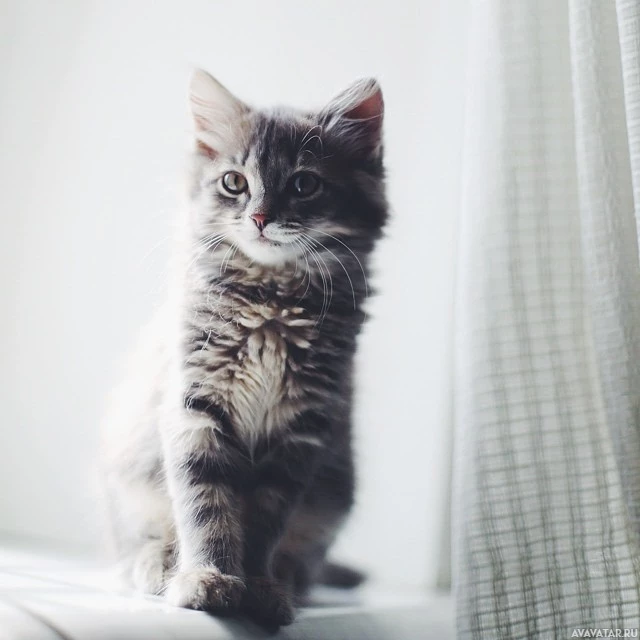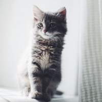a small kitten with a grey coat and darker stripes on its face and legs. It appears to be sitting or standing on a surface near a window, where there is sunlight coming through. The kitten has