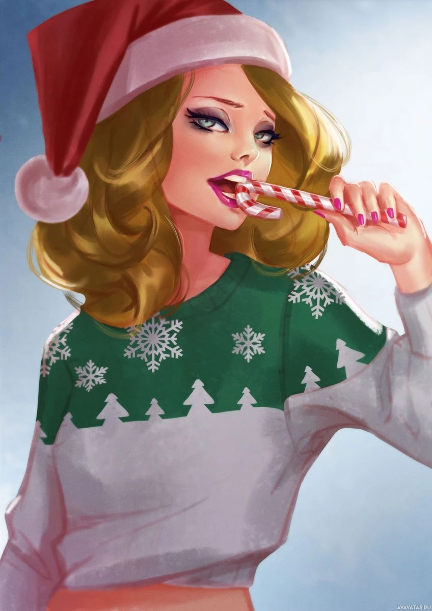 a Santa hat and eating a candy cane. Her attire includes a sweater adorned with Christmas trees, which suggests that the theme of the picture is related to
