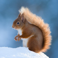 brown fur and white stripes along its back, which are typical features of the red squirrel species. It seems to be looking forward or possibly downwards. This scene suggests it could be wintertime in