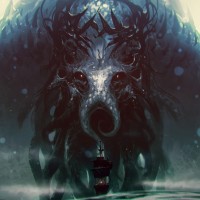 a fantastical scene featuring an octopus-like creature with various tentacles and what appears to be human faces or skulls on its head. It is set in a dark,