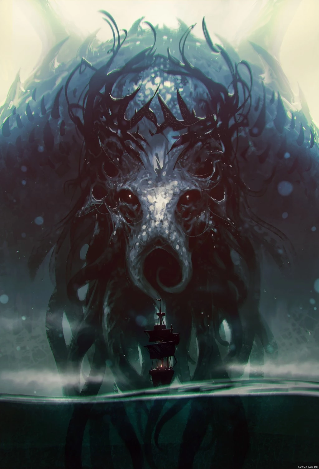 underwater environment where the creature seems to be in control, as there is a smaller figure that could represent a human or an animal looking up at it. The atmosphere suggests a narrative of dread or fear, possibly reminiscent of the mythos associated with Cthulhu, which is commonly referred to as "Cthulhu" in