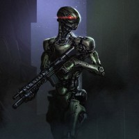 a humanoid figure with mechanical components, such as jointed limbs and a helmet with visor-like structures on the sides. It is holding what looks like a rifle, suggesting a theme of combat or security in the context of the image.