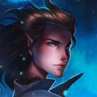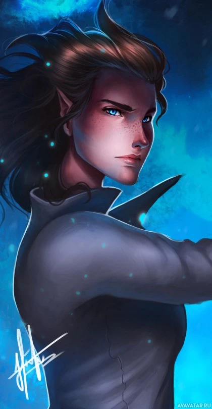 a dark background that seems to be set in a magical or mystical setting. The character has pointed ears and is depicted wearing what looks like a shirt, suggesting a human-like form but with distinctly elven features. The expression on the character's face is calm and composed, with