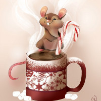 a cup of coffee with steam rising from the cup. The mouse appears to be enjoying
