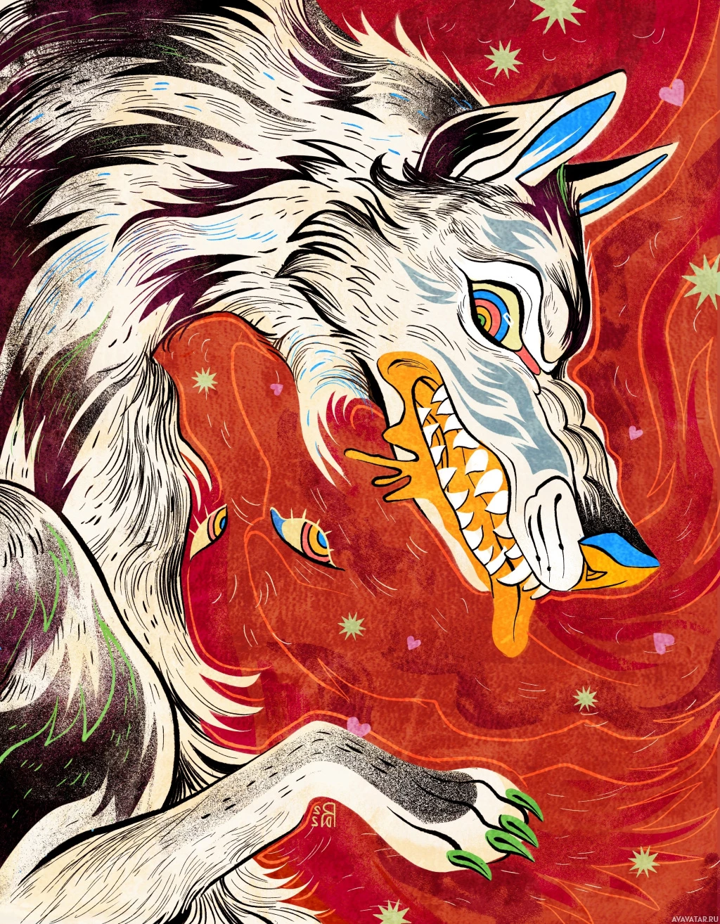 The image depicts an illustration of a wolf with an unusual and stylized design. It has the characteristics of both