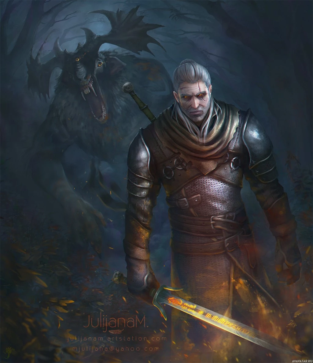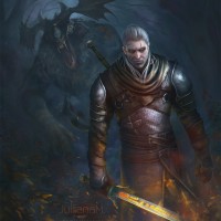 Geralt of Rivia, portrayed by the actor Henry Cavill in the live-action adaptation. He is standing in what appears to be a dark and ominous