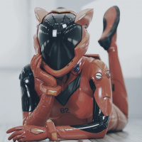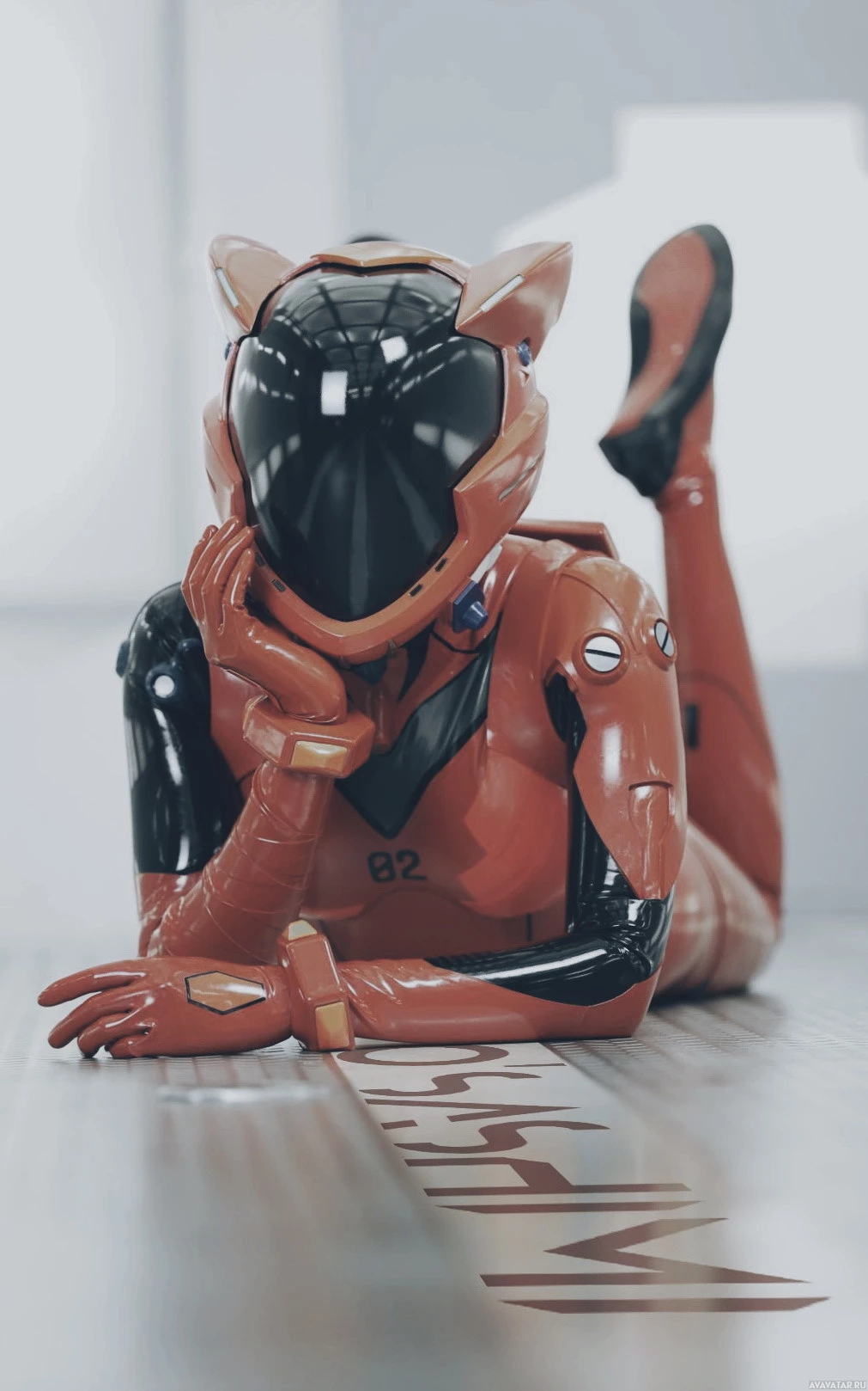 Asuka Langley from the anime series "Neon Genesis Evangelion." The robot is seated with one leg raised, resting its chin on its hand. The background suggests