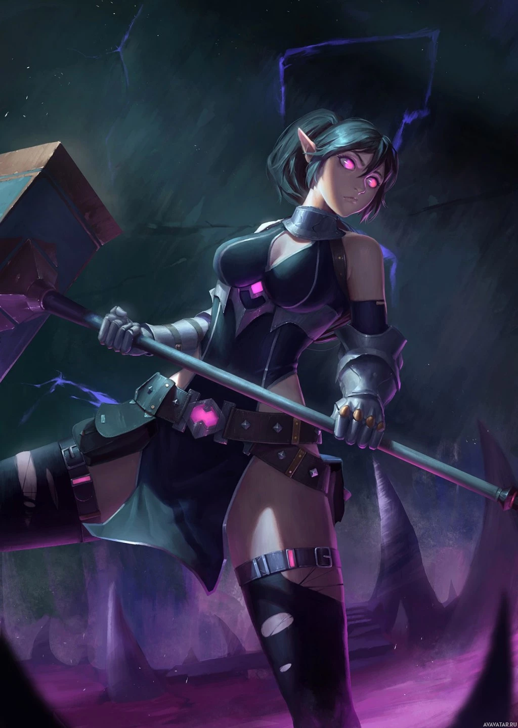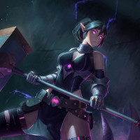 an illustrated character who appears to be a fantasy-style elf. She is holding a hammer in one hand and a shield in the other, suggesting she might be portraying a warrior or fighter archetype. Her outfit includes elements that could indicate armor or battle attire, and her expression seems focused or determined. The background features dark,