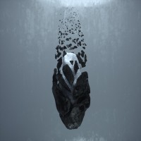 The image shows a rock partially submerged in water, with small bubbles or particles scattered throughout the surrounding area. It appears to be an artistic representation rather than a realistic scenario. The overall effect is quite striking and may evoke themes of isolation, depth, or underwater exploration.