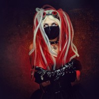 dark clothing and have what appears to be a mask covering their face down to the chin. Their hair is in two distinct colors: one side is red and the other is black with