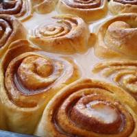 На снимке изображена кастрюля из рулонов корицы, которые известны как кондитерские изделия. Эти рулоны имеют сладкую глазурь над ними и выглядят свежеиспеченными или, по крайней мере, в процессе запекания. Это популярный десерт, которым можно насладиться с кофе или чаем.