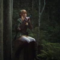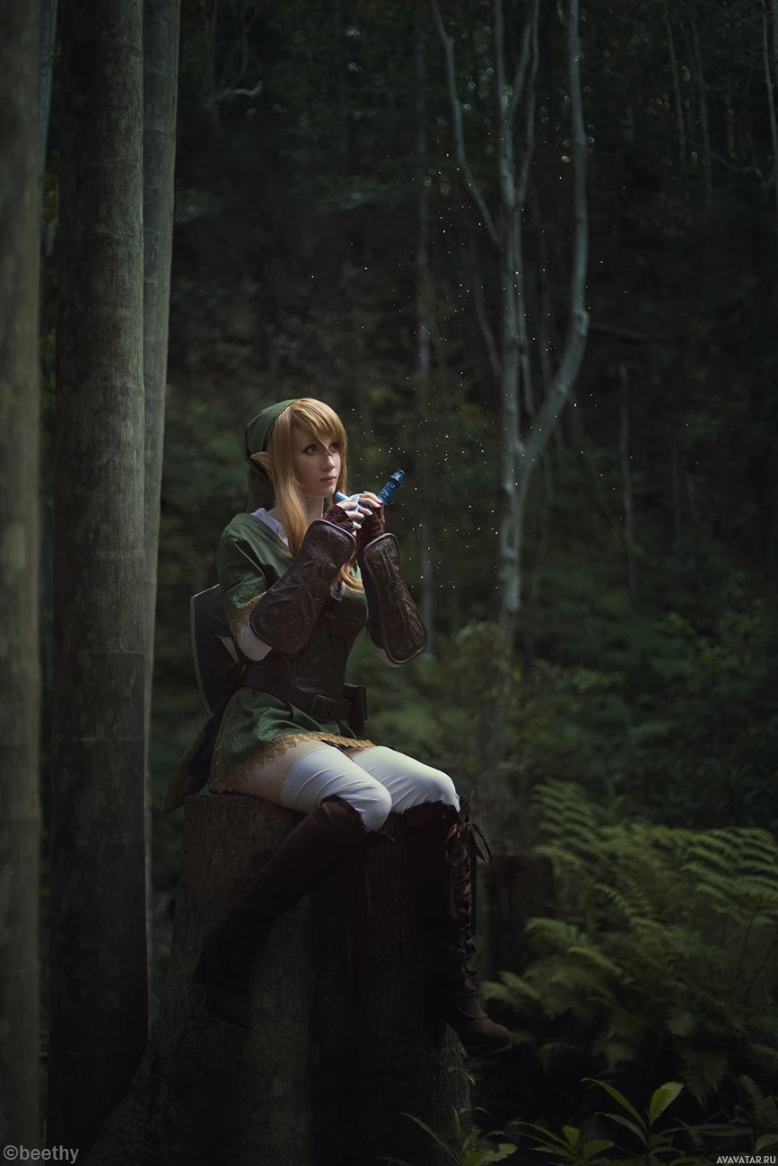 forest at night or under low light conditions. The individual is dressed in fantasy-style clothing with a long coat and boots that resemble typical elven attire, suggesting they are portraying