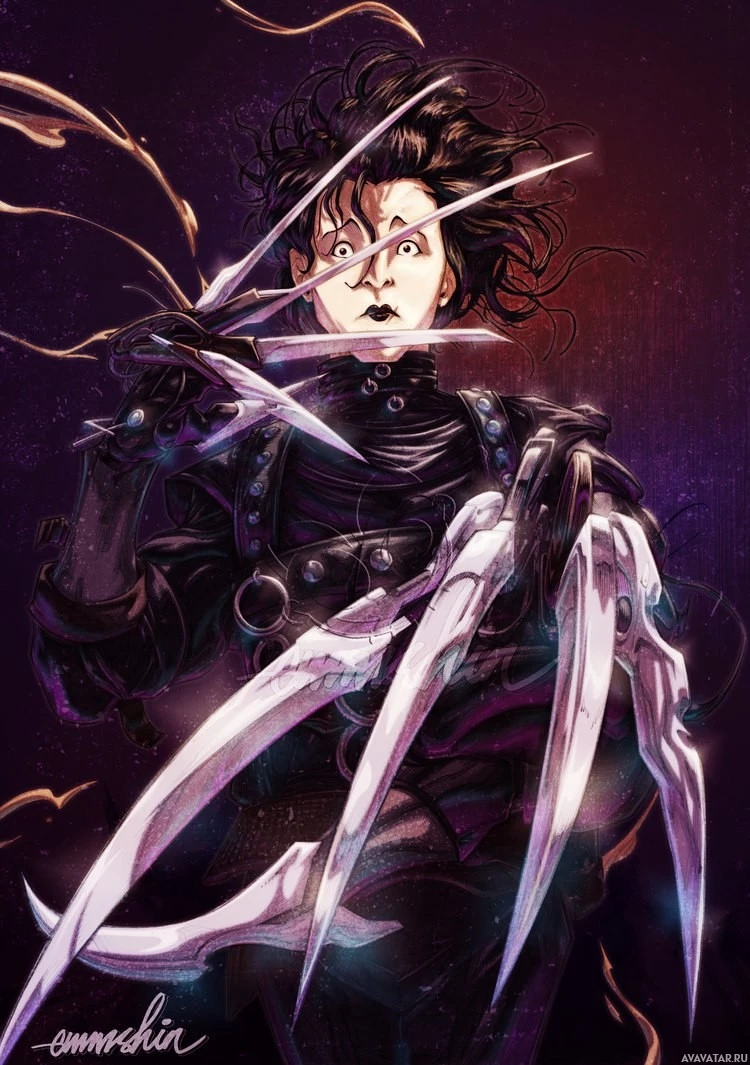 На картинке изображен иллюстрированный персонаж, держащий пару ножей, что напоминает злодейского персонажа, известного как «Джокер» из серии «Бэтмен». Персонаж показан стилизованным и преувеличенным образом, что характерно для комиксов или графических новелл. Фон имеет фиолетовый оттенок с закрученными узорами, что добавляет драматического эффекта изображению.