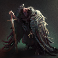 a bird of prey with the body of an eagle or falcon and the head and wings of a lion. This creature stands upright like a human and is holding a sword in its claws. It appears to be wearing armor, suggesting it may have a warrior-like role. The setting seems to be dark and moody, which could imply